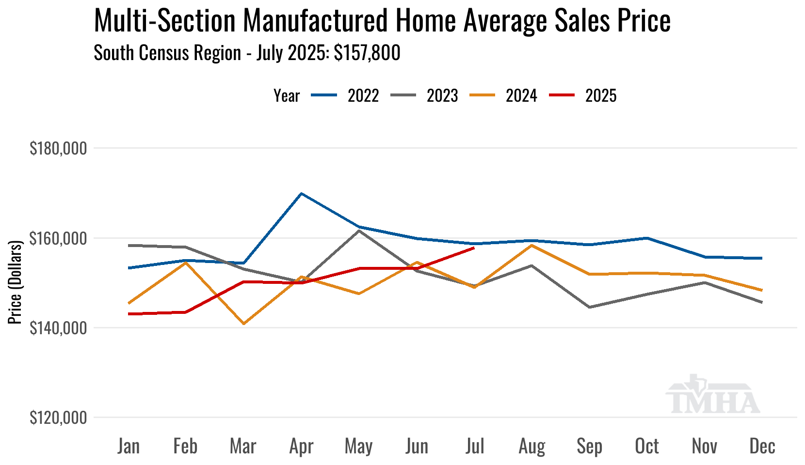 The average sales price for multi-section homes in the South Census Region for July moved up 3% over the previous month coming in at $157,800. The average price was up 5.9% from July of 2024 nominally and up only 3.1% after adjusting for inflation.*