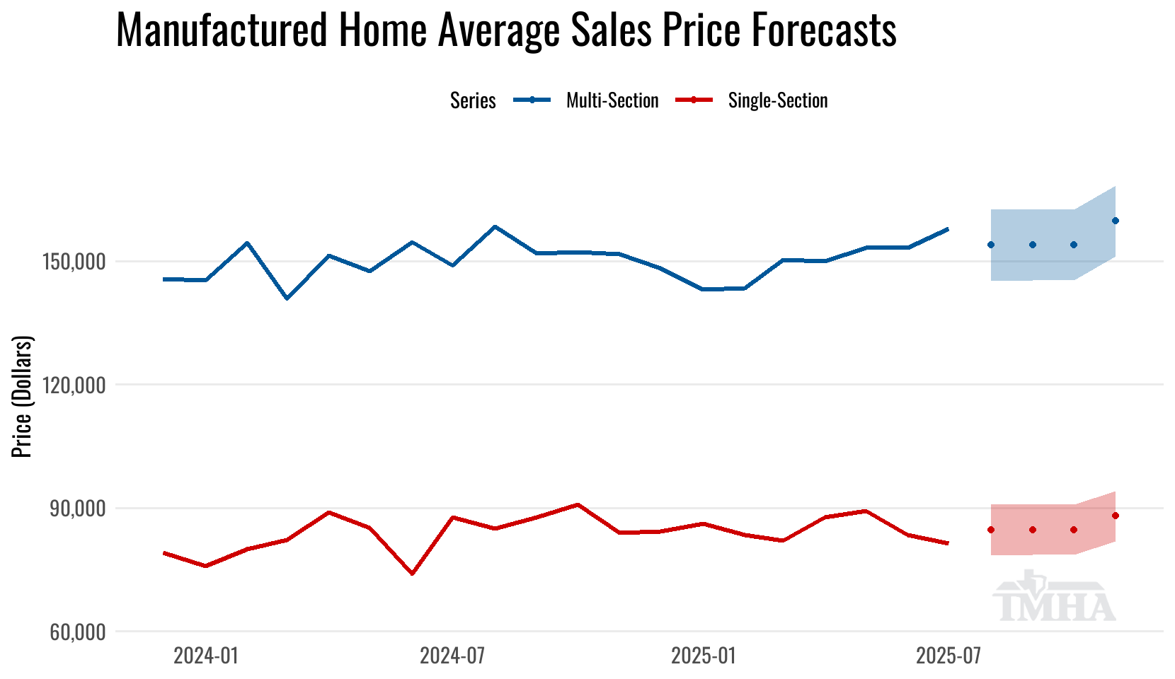 Using a regression model based on the most recent November Producer Price Index for manufactured housing data, the forecasted average multi-section sales price is estimated at $159,700 (+/- $8,700) for multi-sections and $88,000 (+/- $6,200) for single-section homes*.