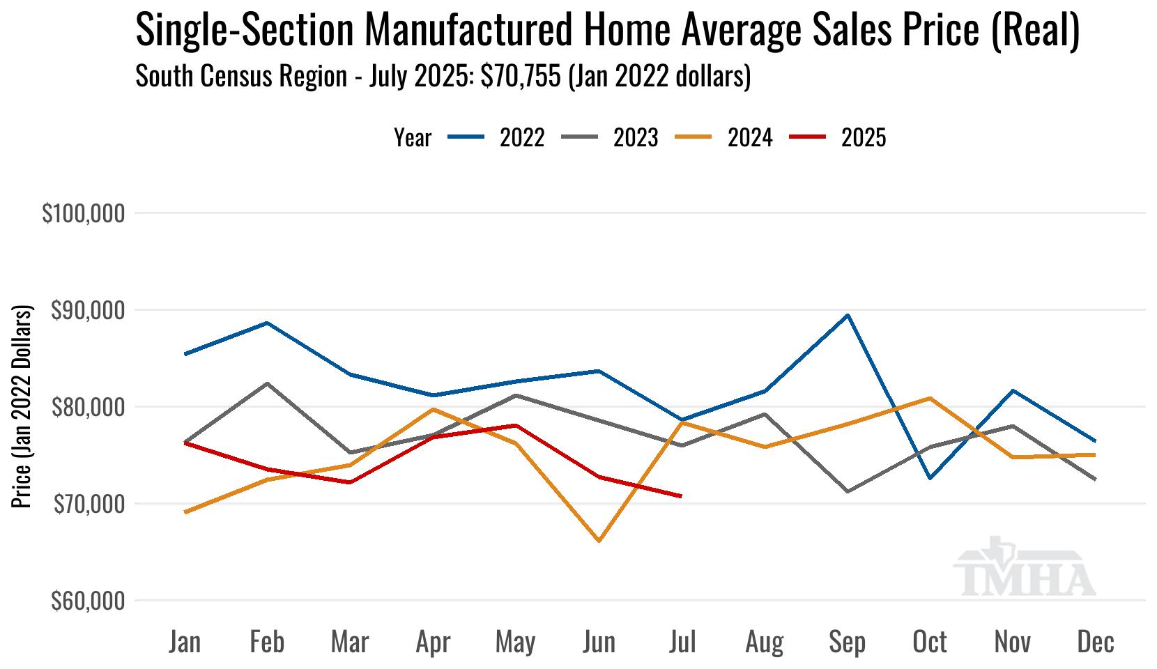 This chart is built off of the US Census Bureau’s Manufactured Housing Survey (MHS) Tables. Price values have been inflation adjusted to January 2022 dollars.