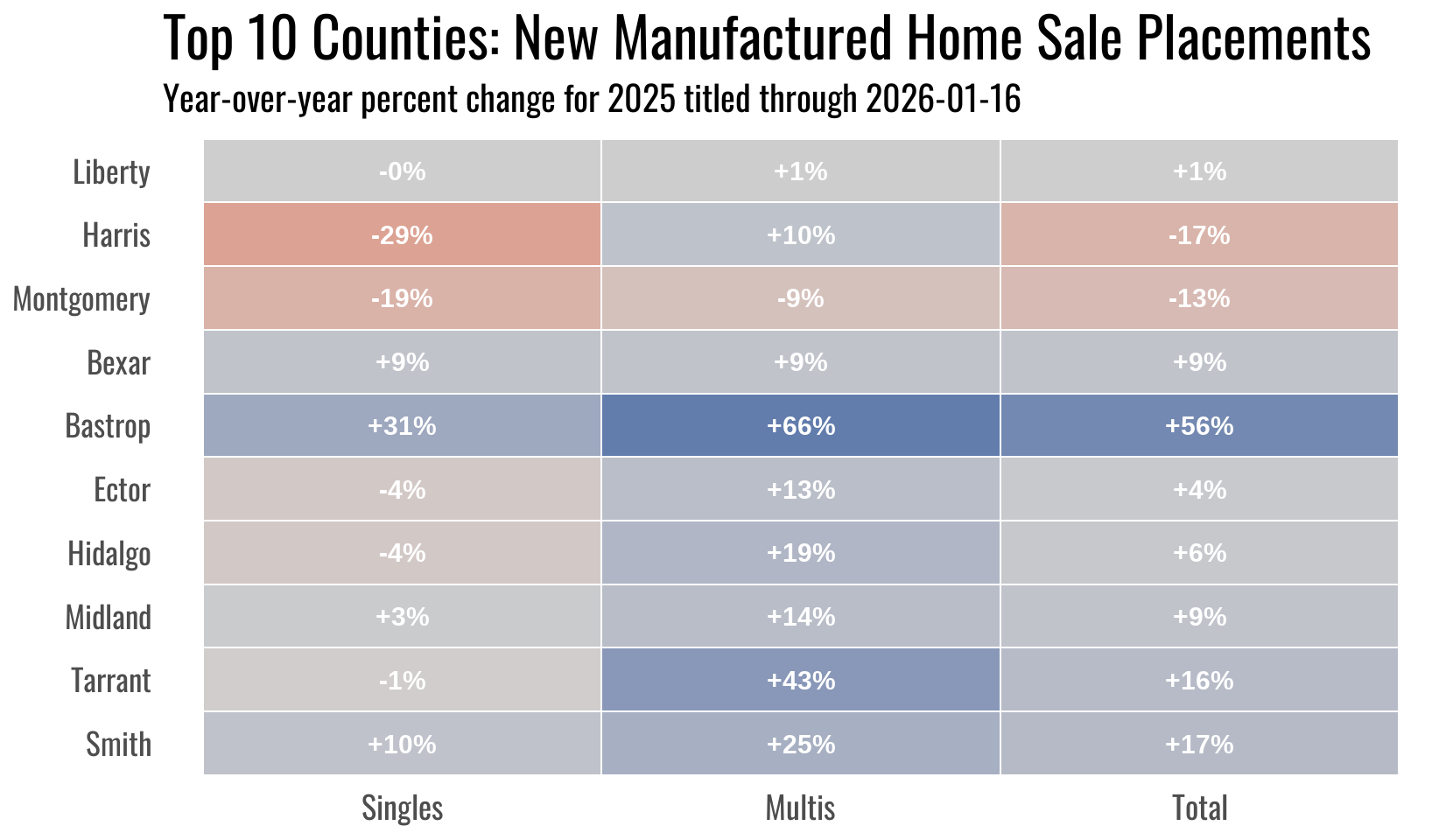Here are the breakdowns in year-over-year changes for the top 10 counties in new home placements across home section types.