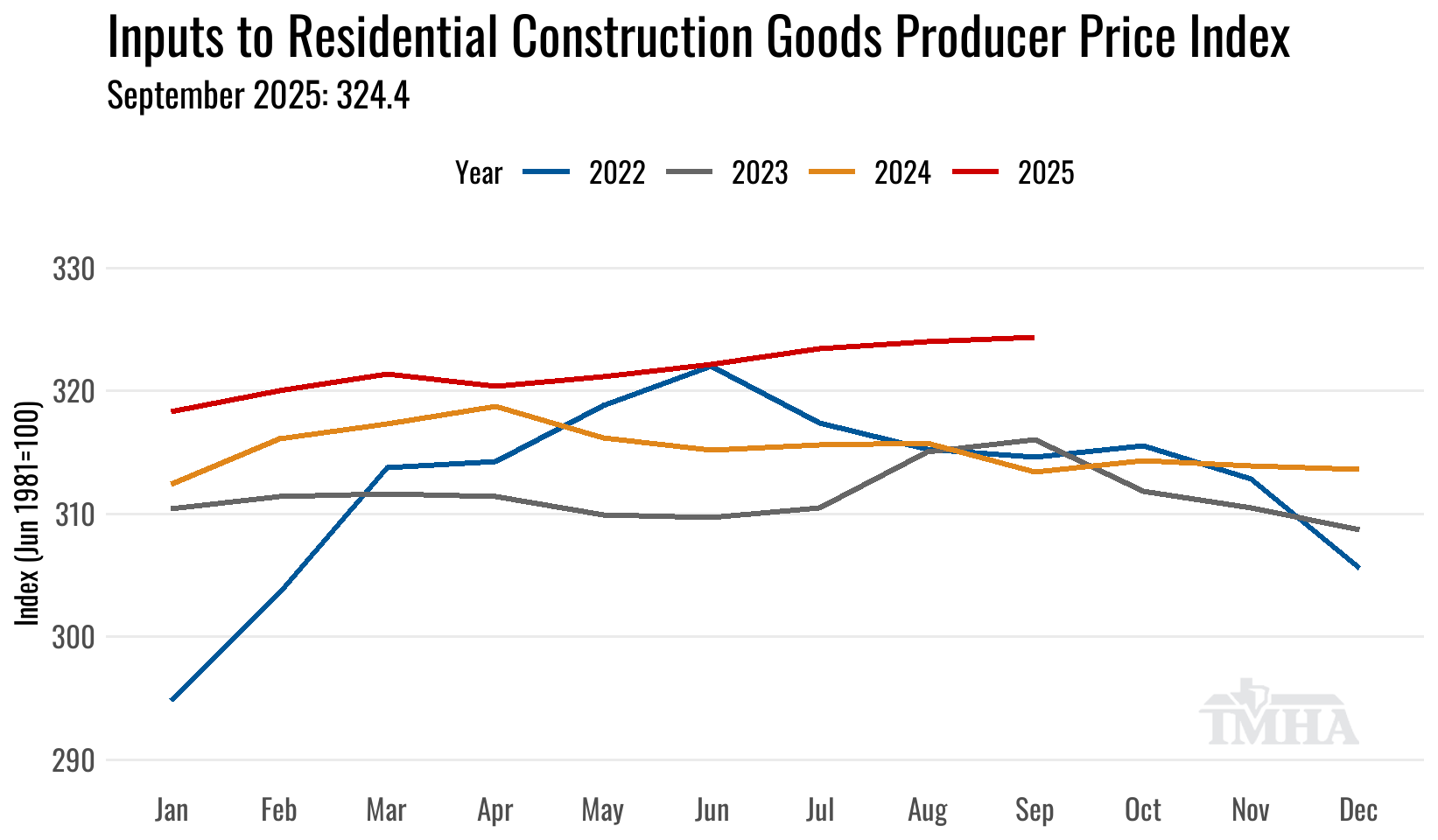 On the costs of materials to manufacturers the PPI for input goods to residential construction moved up slightly by +0.1% in September over the previous month, but was up +3.5% over 2024.