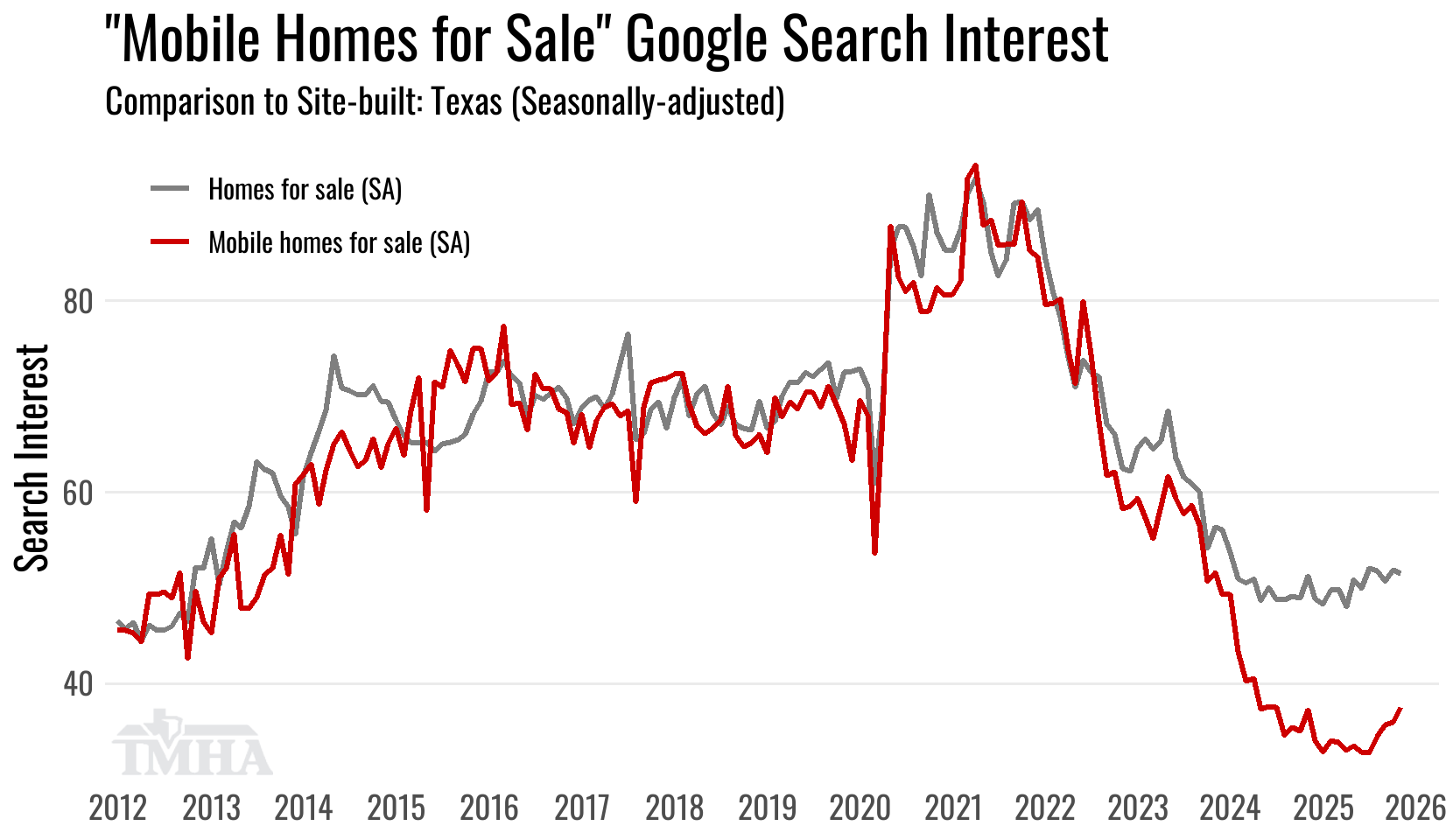 The google trends data is pulled for the search term “mobile homes for sale” because the volume of search data for that term is 10 times higher than the volume of searches for “manufactured homes for sale.” In Texas any home with a HUD-Code label on it is legally a manufactured home, and any home built in a factory prior to the introduction of the HUD-Code in 1976 is a mobile home. Despite the legal definition google search data suggests that consumers tend to characterize modern manufactured homes as mobile homes.