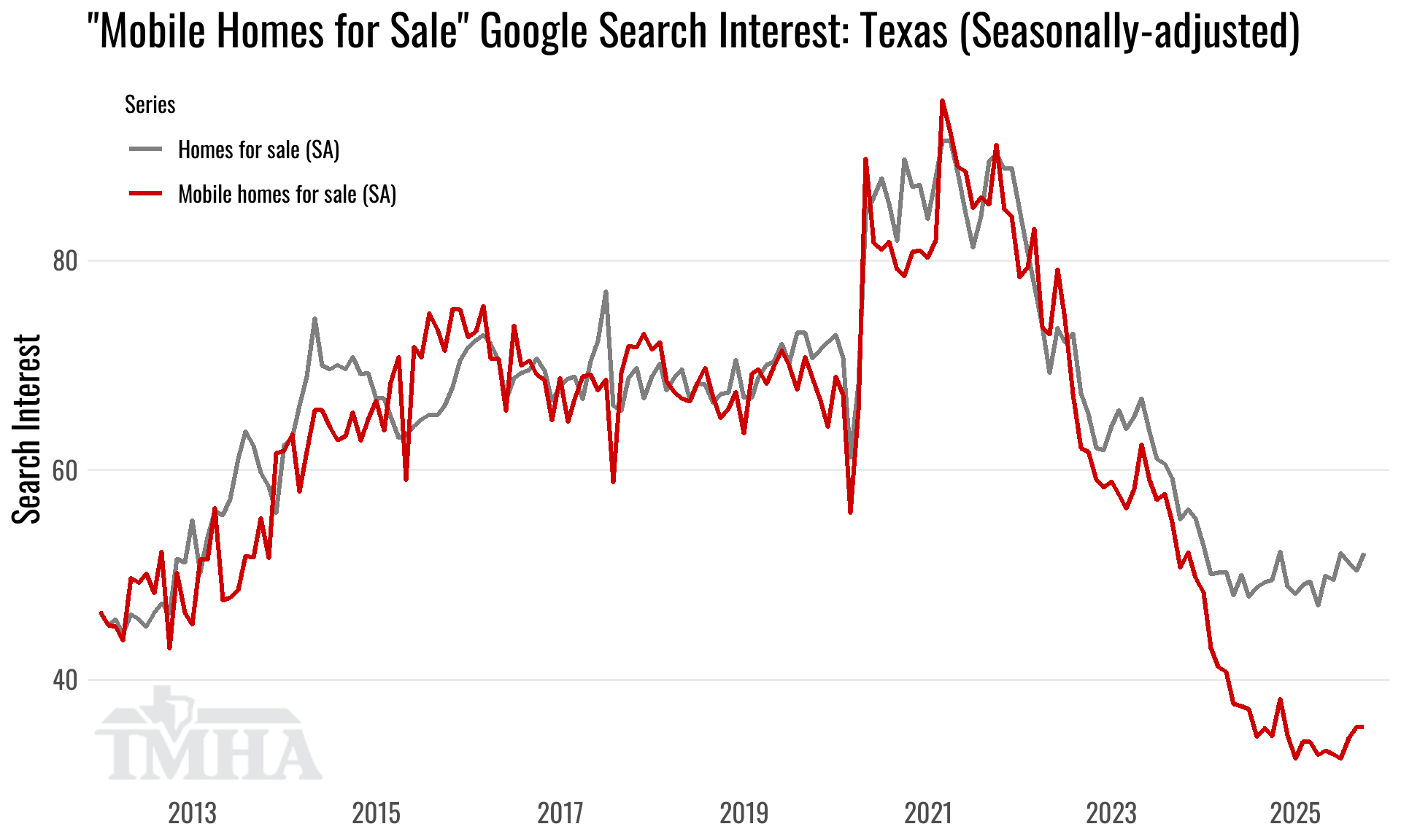 Texans search interest in “mobile homes for sale” moved down slightly in October a seasonally-adjusted -0.4% from the previous month but was up +5.1% over October of 2024. The year-over-year increase marked the first such gain since January of 2022.